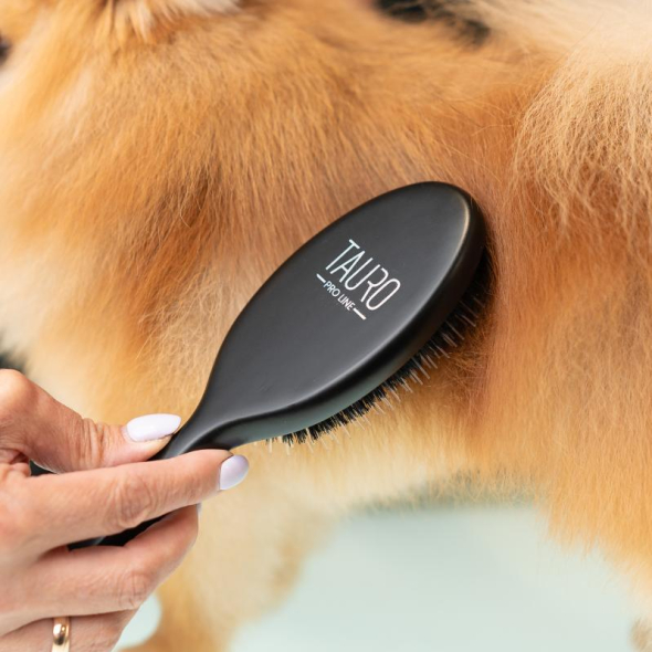 The Tauro Pro Line Prestige Collection Beechwood Brush with nylon pins and boar bristles is a premium grooming tool designed by professionals to simplify pet brushing. Its ergonomic, lightweight design prevents hand fatigue during brushing sessions. This brush is ideal for adding volume to long, dense coats, effortlessly brushing out tangles, and enhancing shine with boar bristles. The special pins provide gentle care while preventing hair breakage. Thanks to its anti-static properties that help prevent static buildup, resulting in smoother and shinier coats. It also ensures the smooth distribution of your pet's natural coat oils. Discover the Tauro Pro Line brushes, crafted by professionals using top-quality materials to ensure optimal results and an enjoyable brushing experience.