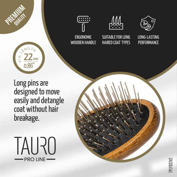 The Tauro Pro Line Massage Brush is a premium grooming tool designed by professionals to simplify pet brushing. Its ergonomic design ensures it is lightweight, preventing hand fatigue during brushing sessions. Thanks to its special shape, the brush will comb through even the densest coats. The special STOP technology prevents the teeth from getting stuck inside the cushion, while the oval tooth head effectively massages the pet's skin, improving blood circulation. The special anti-static coating on the brush prevents hair from becoming electrified, resulting in smoother and shinier coats. Discover the Tauro Pro Line brushes, crafted by professionals using top-quality materials to ensure optimal results and an enjoyable brushing experience. It is designed for medium and large breeds or pets with a substantial amount of coat.