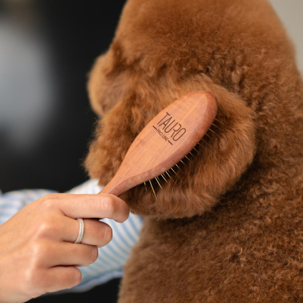 The Tauro Pro Line Prestige Collection Pearwood Brush is a premium grooming tool designed by professionals to simplify pet brushing. Its ergonomic design ensures it is lightweight, preventing hand fatigue during brushing sessions. This is a large-size brush, specifically designed for medium and large breeds or pets with a high coat volume. The special STOP technology prevents the pins from getting stuck inside the cushion, while the oval pin head effectively massages the pet's skin, improving blood circulation. The special anti-static coating on the brush prevents hair from becoming static, resulting in smoother and shinier coats. Discover the Tauro Pro Line brushes, crafted by professionals using top-quality materials to ensure optimal results and an enjoyable brushing experience.
