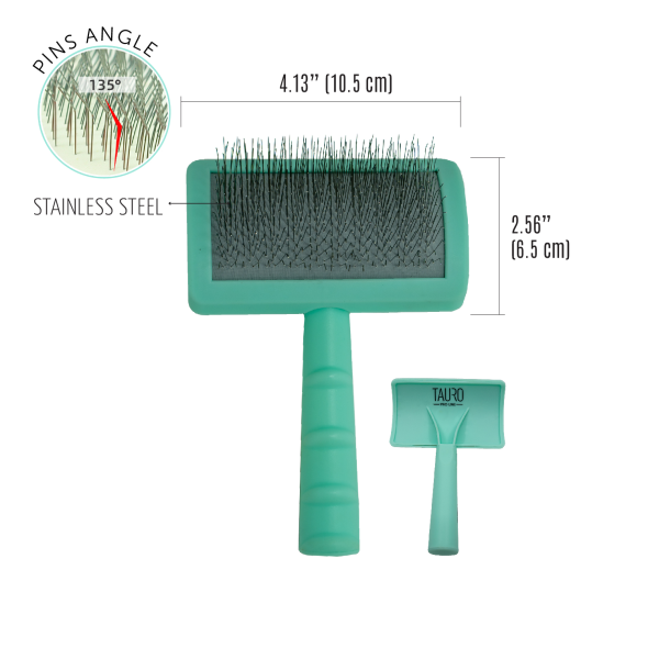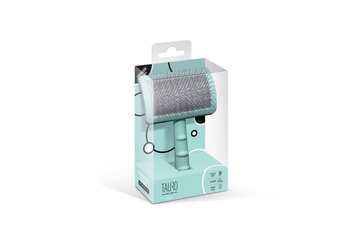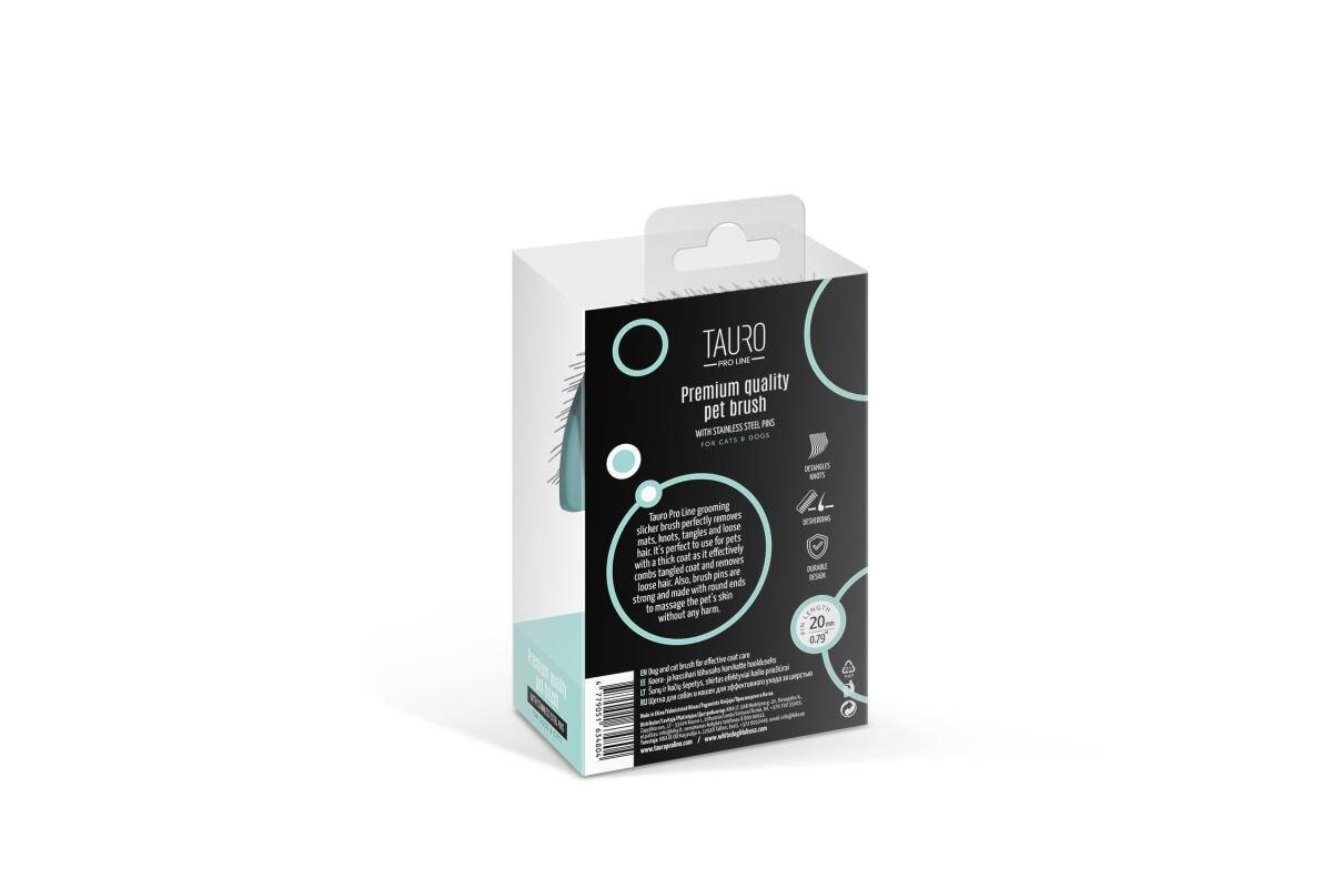The Tauro Pro Line premium brush is expertly designed to make pet brushing easier. Its ergonomic design ensures it is lightweight, preventing hand fatigue during brushing sessions. The soft and elastic cushion adapts to your pet's skin, while the 20 mm long curved stainless steel teeth effectively comb through the coat, remove dead hair and tangles, and provide a gentle massage to improve circulation and promote hair growth. With this Tauro Pro Line brush, you can easily reach even hard-to-reach areas: armpits, muzzle, ears, and paws. Suitable for all coat types and compatible with small, medium, and large breeds. The special anti-static coating on the brush prevents hair from becoming electrified, resulting in smoother and shinier coats. Discover the Tauro Pro Line brushes, crafted by professionals using top-quality materials to ensure optimal results and an enjoyable brushing experience.