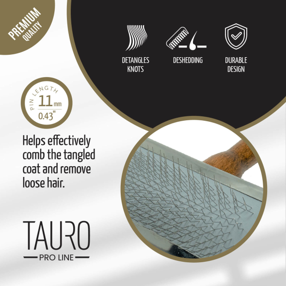 The Tauro Pro Line premium brush is expertly designed to make pet brushing easier. Its ergonomic design ensures it is lightweight, preventing hand fatigue during brushing sessions. The soft and flexible pad adjusts to your pet's skin, while the 11 mm long and 0.4 mm thick stainless steel teeth effortlessly comb through the coat, to fluff it out, removing dead hair, tangles, and providing a gentle massage that improves blood circulation and promotes hair growth. With this Tauro Pro Line brush, you can easily reach even hard-to-reach areas: armpits, muzzle, ears, and paws. Suitable for all coat types and compatible with small, medium, and large breeds. The special anti-static coating on the brush prevents hair from becoming electrified, resulting in smoother and shinier coats. Discover the Tauro Pro Line brushes, crafted by professionals using top-quality materials to ensure optimal results and an enjoyable brushing experience.
