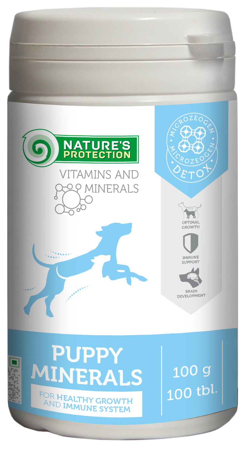 Nature's Protection Puppy Minerals is a specially formulated mineral feed supplement that provides essential minerals for growing puppies. This mineral feed supplement is made with high-quality ingredients that support the development of healthy bones, muscles, and organs. This specially designed mineral feed is enriched with clinoptilolite of volcanic origin from nature – Microzeogen. The unique structure of the mineral allows it to attract and trap positively charged ions, such as heavy metals and toxins, while allowing other beneficial ions to pass through. It acts as an antioxidant and removes toxins, heavy metals, and viruses from the pet's body, when it is detoxified the body is cleaned and ready to absorb the antioxidants, vitamins and minerals into the body. The composition also contains Calcium, which is important for strong bones and teeth, as well as phosphorus – for energy metabolism and healthy cell function. It also contains Magnesium, which supports muscle and nerve function, and Zinc, which is important for immune system health and healthy skin and coat. The mineral Nature’s Protection Puppy Minerals feed supplement is a convenient and effective option to ensure your puppy gets the minerals they need for healthy growth and development.