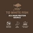 Composition: white fish min. 24 % (dried and finely ground), potato flakes, pregelatinised potato starch, hydrolysed feather meal, sorbitol, glycerine, glucose syrup, pea fibre (4 %), salmon oil (3 %), dynamic micronized clinoptilolite (1 %), chitosamine (from aquatic animals) (1 %), fructooligosaccharides (FOS), green tea extract (0,5 %), glucosamine (500 mg/kg), chondroitin sulphate (250 mg/kg), dried algae Schizochytrium sp. (0,16 %).