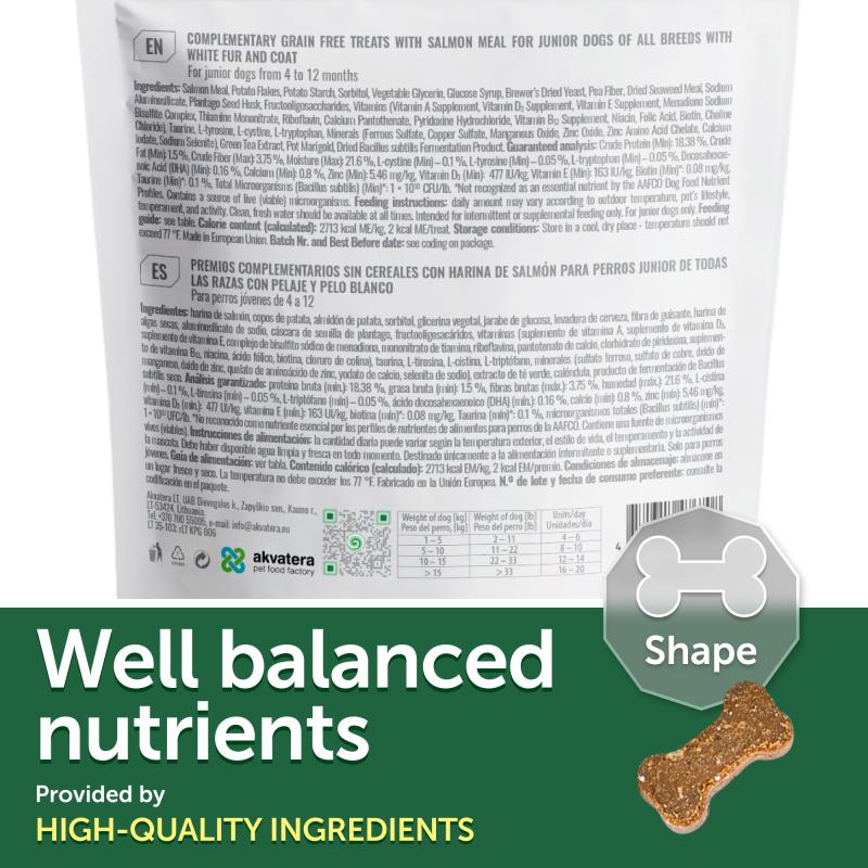 Nature's Protection Superior Care White Dogs Grain Free Sensitive Care supplemental snacks perfect for pet's overall well-being and sensitive care. The main protein source in these supplemental snacks is salmon, a highly digestible, hypoallergenic protein rich in omega-3 fatty acids, vitamins, and minerals. Additionally, salmon is known as a highly palatable protein source. These functional snacks – supplements have a wetter and softer texture than the usual treats. Wetter products reveal a more natural aroma, making them a favourite for even the pickiest pets. Supplemental snacks are enriched with clinoptilolite of volcanic origin from nature - MicroZeoGen, which helps to remove toxins and improve nutrient absorption. The composition contains Schizochytrium sp. microalgae which is a source of vitamins such as A, C, E and K, as well as minerals such as iron, zinc, and selenium. These nutrients help support healthy vision. While Omega-3 fatty acids support brain functions. The supplemental snacks do not contain ingredients of grain origin, corn or soy products that can cause allergic reactions.