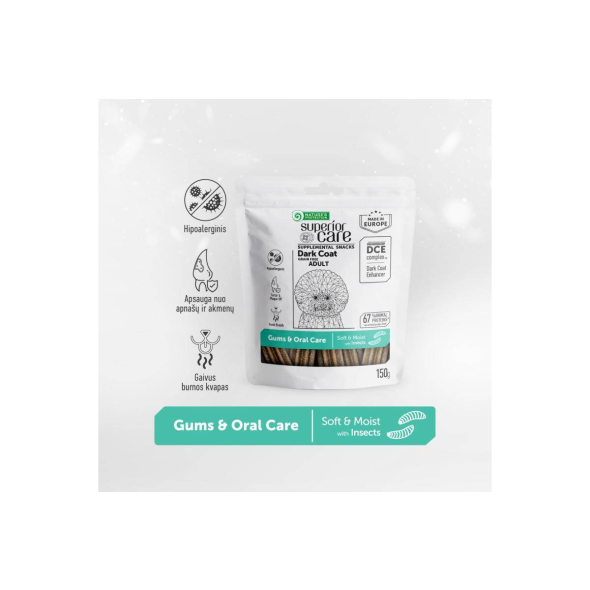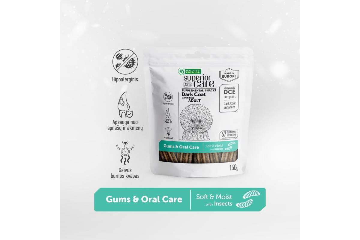 NATURE'S PROTECTION SUPERIOR CARE complementary grain free feed – snacks to support healthy gums and oral care with insects for adult dark coat dogs 150 g