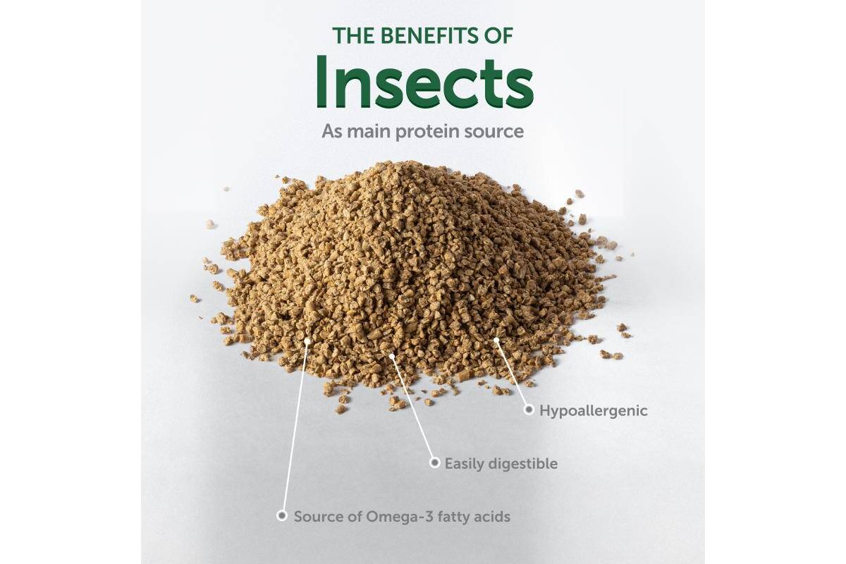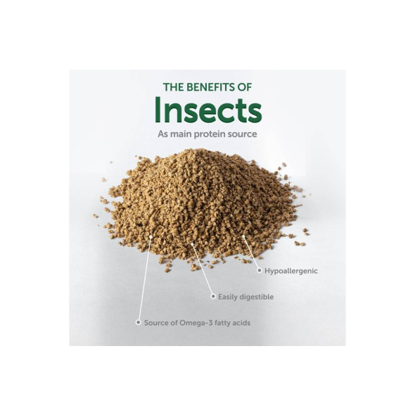 - Insects as the main protein source: hypoallergenic, easily digestible, and rich in Omega-3 and Omega-6 for a shiny coat and healthy growth.