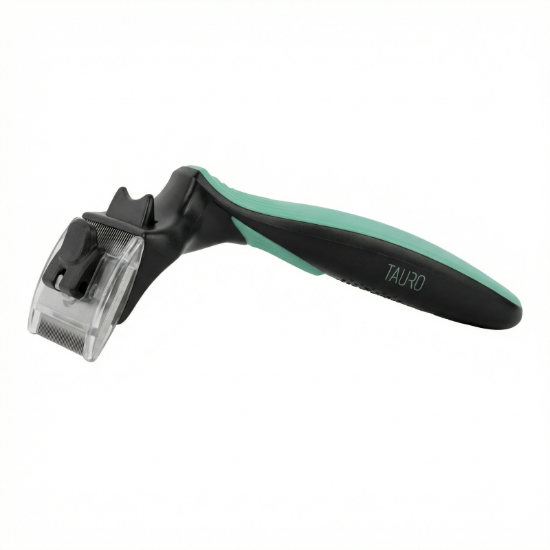 TAURO undercoat comb designed for effective removal of excess coat and dead undercoat. Double stainless steel teeth allow even brushing while helping reduce friction during regular coat care.