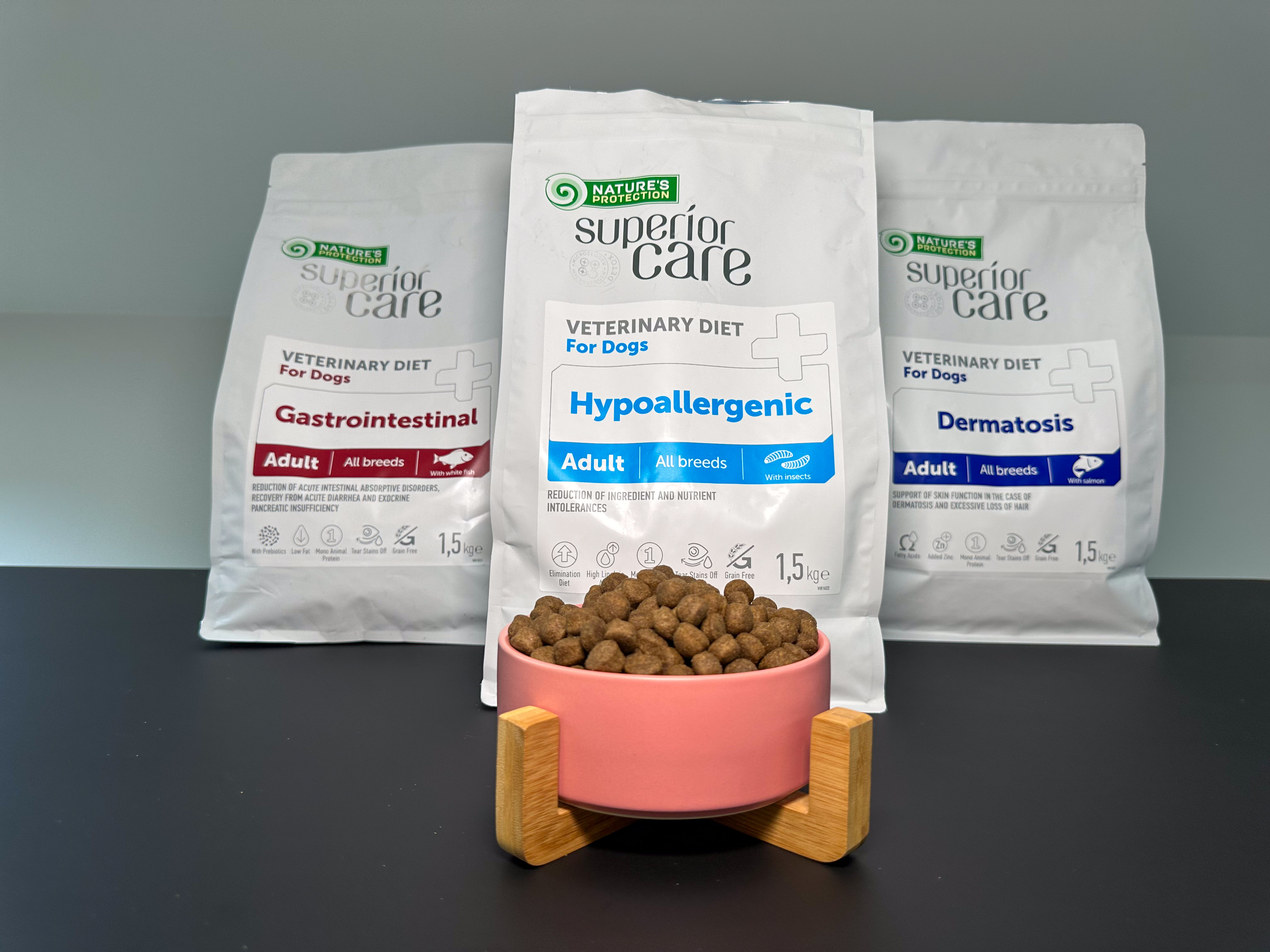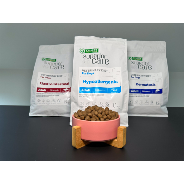 Nature's Protection Superior Care Veterinary Diet Dermatosis dog food ingredients were exceptionally balanced to improve skin and coat health. It contains a single source of animal protein, which helps avoid other animal protein allergens in the diet that might cause symptoms. The specially selected diet recipe does not contain grains or gluten, reducing the risks of allergy to cereal proteins and gluten intolerance.