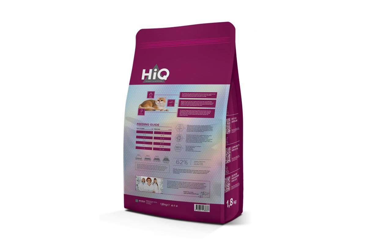 HiQ Sterilised Care is a Super Premium (premium) quality dry feed for adults, 1 year old and older cats after sterilization and cats after castration. The composition of this dry feed is enriched with unique ingredients that will help maintain a healthy body and energy balance. The ingredient will not only provide your cat's body with all the necessary materials, but will also ensure better absorption of materials and easierdigestion.
