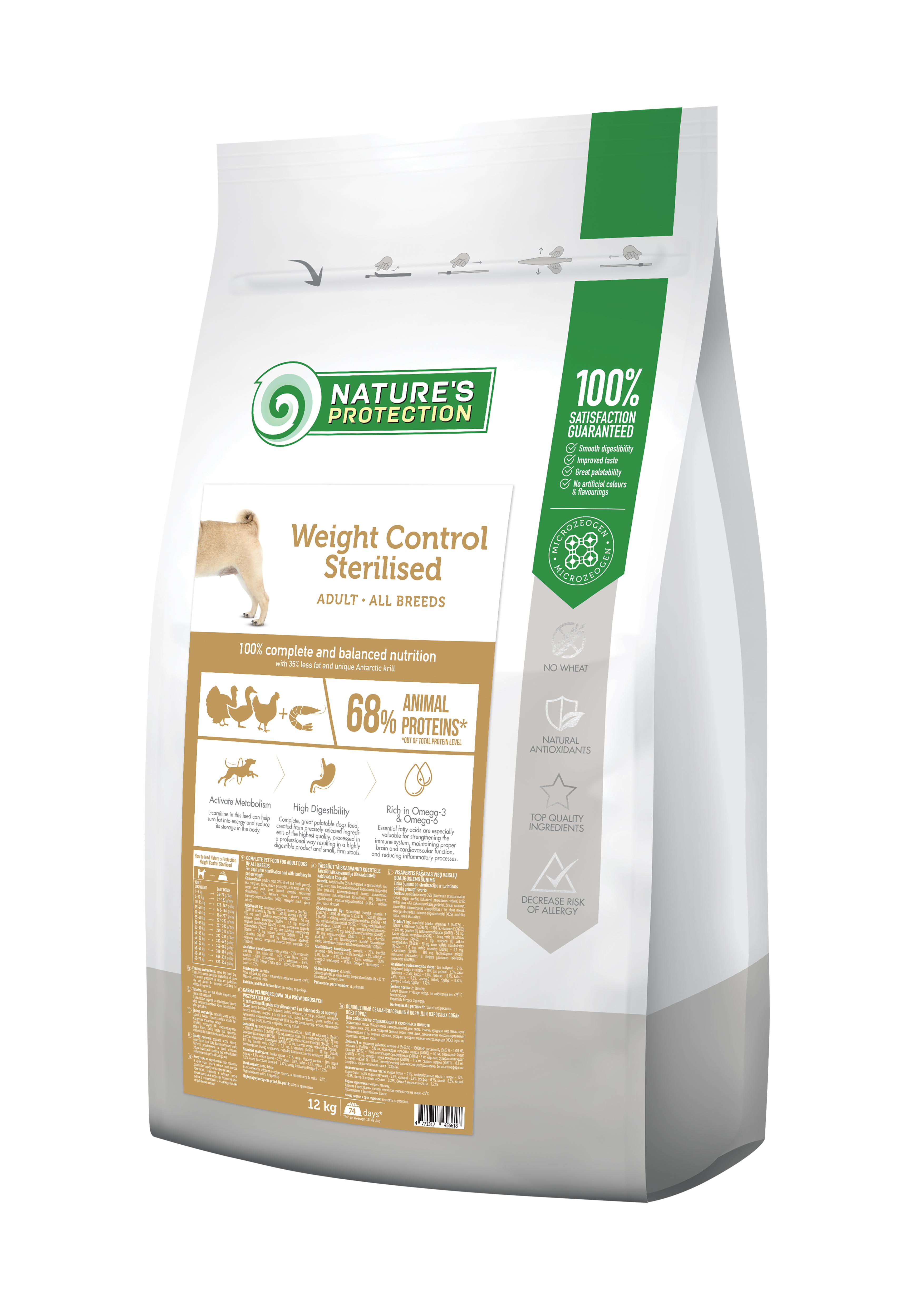 Nature's Protection Weight Control for Sterilised Adult All Breed Dogs with Poultry is known for its well-balanced composition and raw materials, which help to improve the smooth digestive system, maintain healthy weight and resulting small, firm stools. The main protein source of this dry dog food is poultry. It is a high quality protein that is an excellent source of nutrition for dogs, as it is packed with essential nutrients that can help promote overall health. It also contains an Antarctic krill, a unique and 100% sustainable source of Omega-3 and choline, which improves skin and coat condition, reduces inflammation, and supports brain activity. This dry dog food's complete and balanced composition is enriched with natural supplements like MicroZeoGen that help remove toxins from the body and support a healthy immune system. The composition contains Omega-3 and Omega-6 fatty acids essential for healthy skin and coat conditions. As well as mono- and polyunsaturated fatty acids support the immune system, while saturated fatty acids provide energy to a dog. Also, the feed contains superfood Marigold blossoms, known for their anti-inflammatory properties, and natural antioxidants - vitamin E and rosemary extract can help protect cells against the negative impact of free radicals in a completely natural way. All ingredients are carefully selected by veterinary and nutritional experts based on the true needs of your pet.