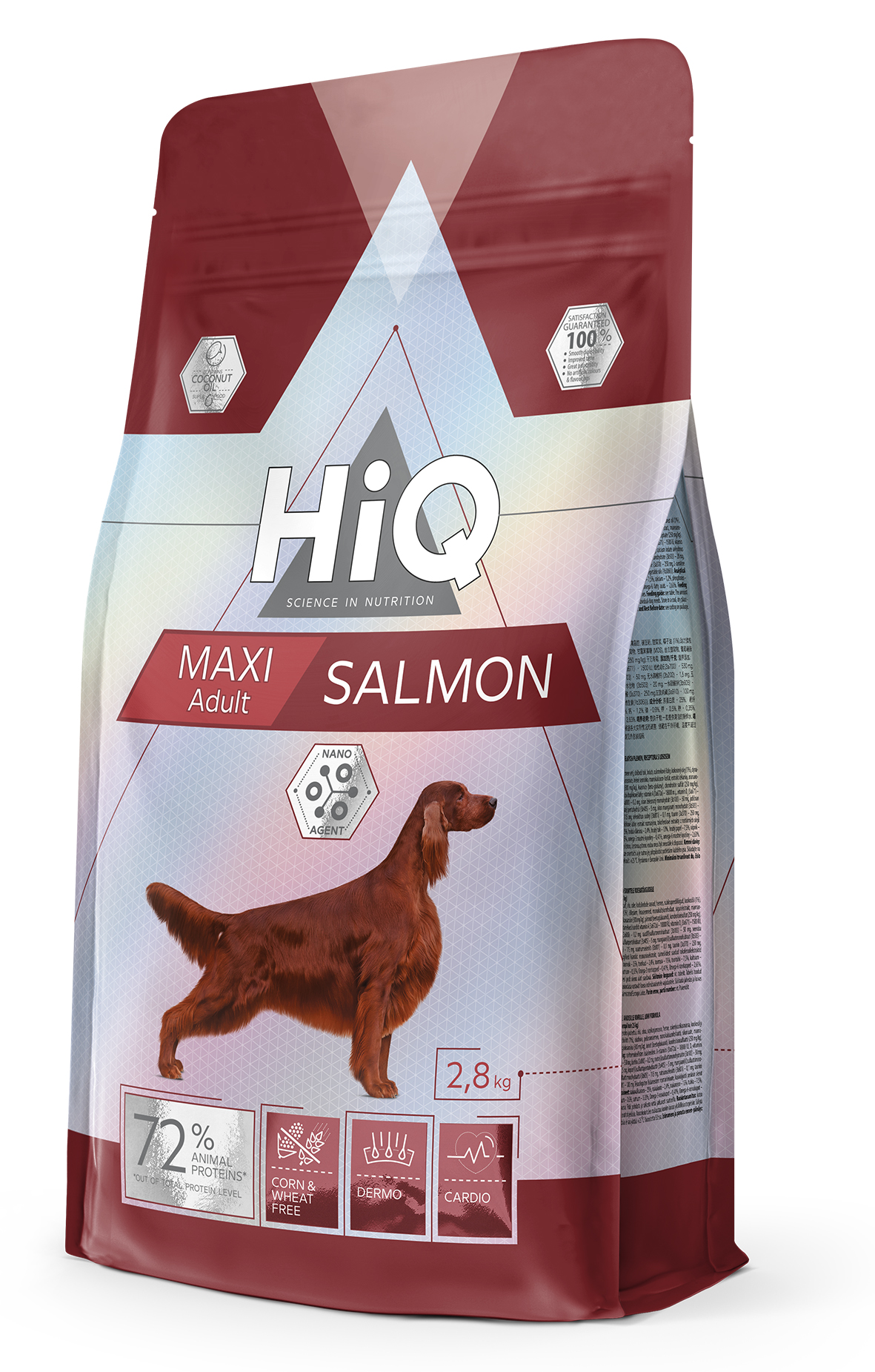 HiQ Maxi Adult Salmon - Super Premium (top) quality dry food with salmon for large breeds (from 25 kg) for adult dogs. It is designed to improve the work of the circulatory system, reduce the load on the heart.