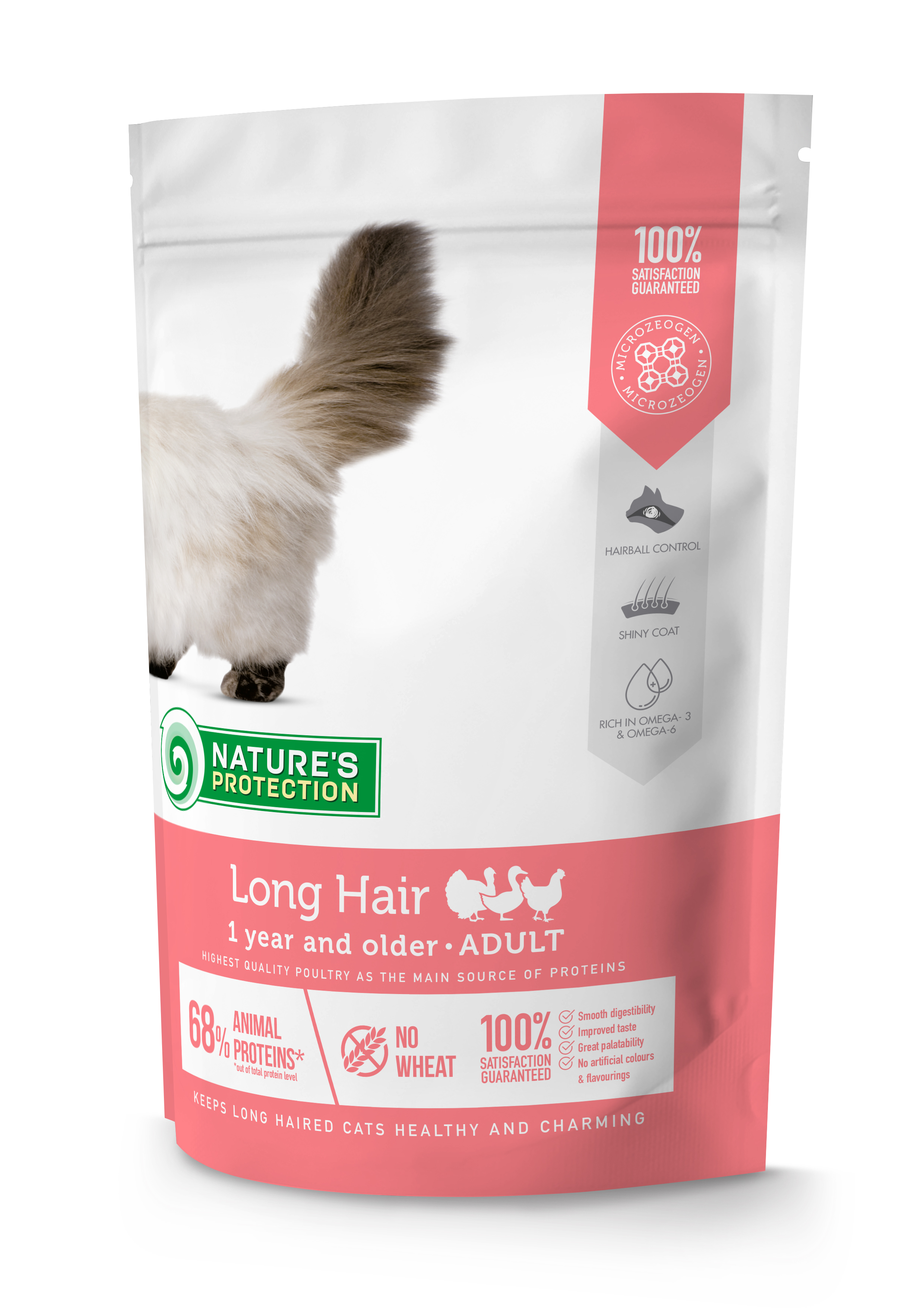 Nature's Protection Long Hair for adult cats are created with ingredients that are perfect for providing the necessary amount of calories, vitamins and minerals for cats with long coat. The main protein source of this dry cat food is poultry. It is a high quality protein that is an excellent source of nutrition for cats, as it is packed with essential nutrients that can help promote good health. This dry food's complete and balanced composition is enriched with natural supplements likeMicroZeoGen that help remove toxins from the body and support a healthy immune system. The composition is enriched with Omega-3 and Omega-6 fatty acids essential for healthy skin and coat conditions. As well as mono- and polyunsaturated fatty acids support the immune system, while saturated fatty acids provide required energy. This cat food is also fiber-rich diet designed to aid in hairball control, promoting healthy digestion and ensuring the overall well-being of cats. All ingredients are carefully selected by veterinary and nutritional experts based on the true needs of your pet.