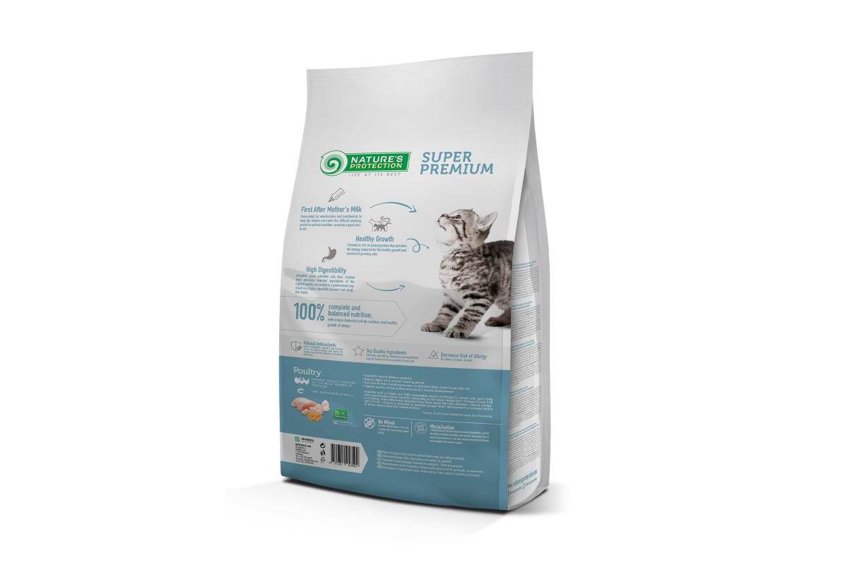 Nature's Protection Kitten is created with ingredients that are perfect for providing the necessary amount of calories, vitamins and minerals for kittens development and energy. The main protein source of this dry cat food is poultry. It is a high quality protein that is an excellent source of nutrition for cats, as it is packed with essential nutrients that can help promote good health. It also contains an Antarctic krill, a unique and 100% sustainable source of Omega-3 and choline, which improves cardiovascular health, reduces inflammation and supports brain activity. This dry kittens food's complete and balanced composition is enriched with natural supplements like MicroZeoGen that help remove toxins from the body and support a healthy immune system. The composition is enriched with Omega-3 and Omega-6 fatty acids essential for healthy skin and coat conditions. As well as mono- and polyunsaturated fatty acids support the immune system, while saturated fatty acids provide the required energy. All ingredients are carefully selected by veterinary and nutritional experts based on the true needs of your pet.