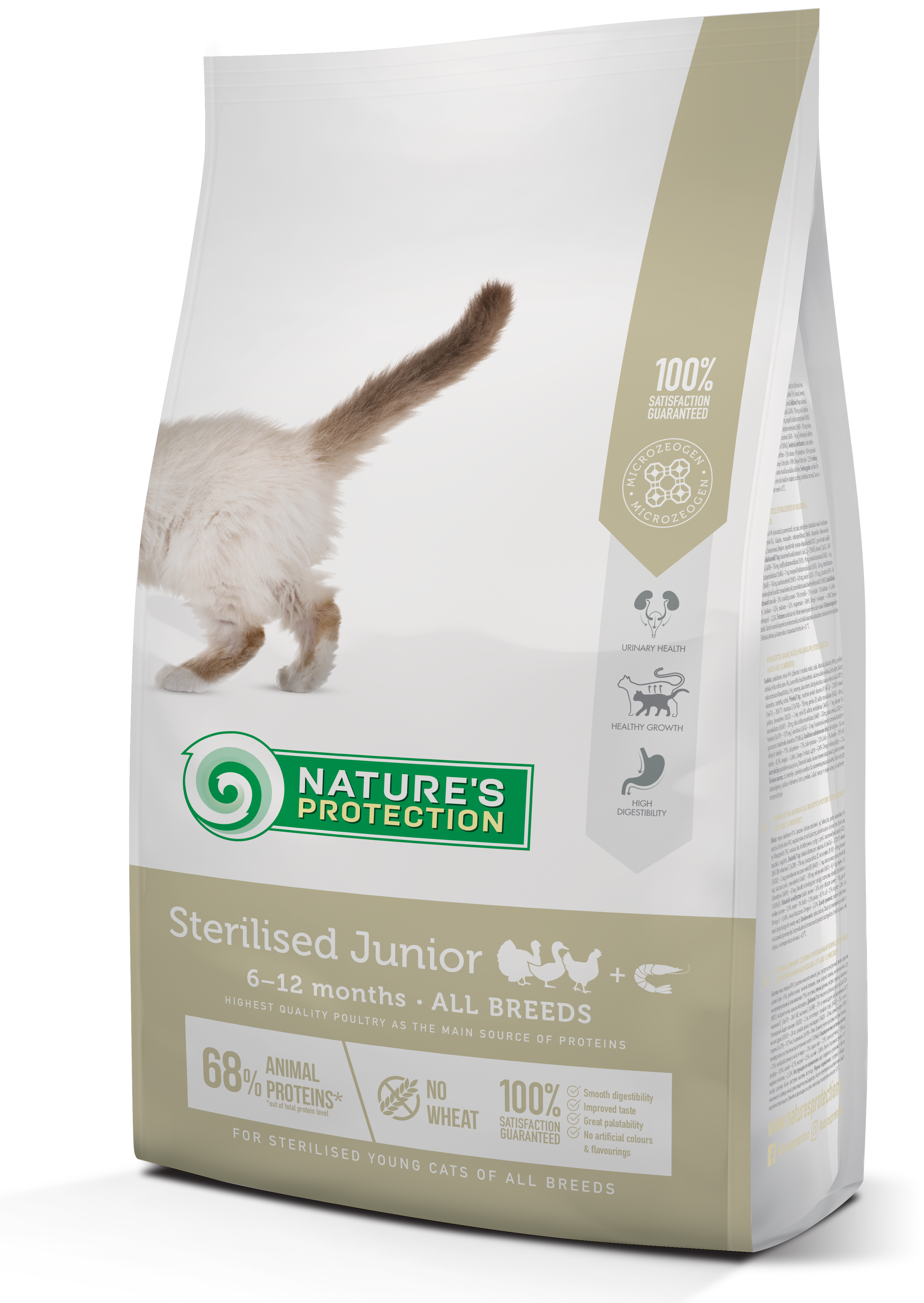 Nature's Protection Sterilised Junior for kittens are created with ingredients that are perfect for providing the necessary amount of calories, vitamins and minerals for kittens development. The main protein source of this dry cat food is poultry. It is a high quality protein that is an excellent source of nutrition for cats, as it is packed with essential nutrients that can help promote good health. It also contains an Antarctic krill, a unique and 100% sustainable source ofOmega-3 and choline, which improves cardiovascular health, reduces inflammation, and supports brain activity. This dry kittens food's complete and balanced composition is enriched with natural supplements like MicroZeoGen that help remove toxins from the body and support a healthy immune system. The composition is enriched with Omega-3 and Omega-6 fatty acids essential for healthy skin and coat conditions. As well as mono- and polyunsaturated fatty acidssupport the immune system, while saturated fatty acids provide required energy. All ingredients are carefully selected by veterinary and nutritional experts based on the true needs of your pet.