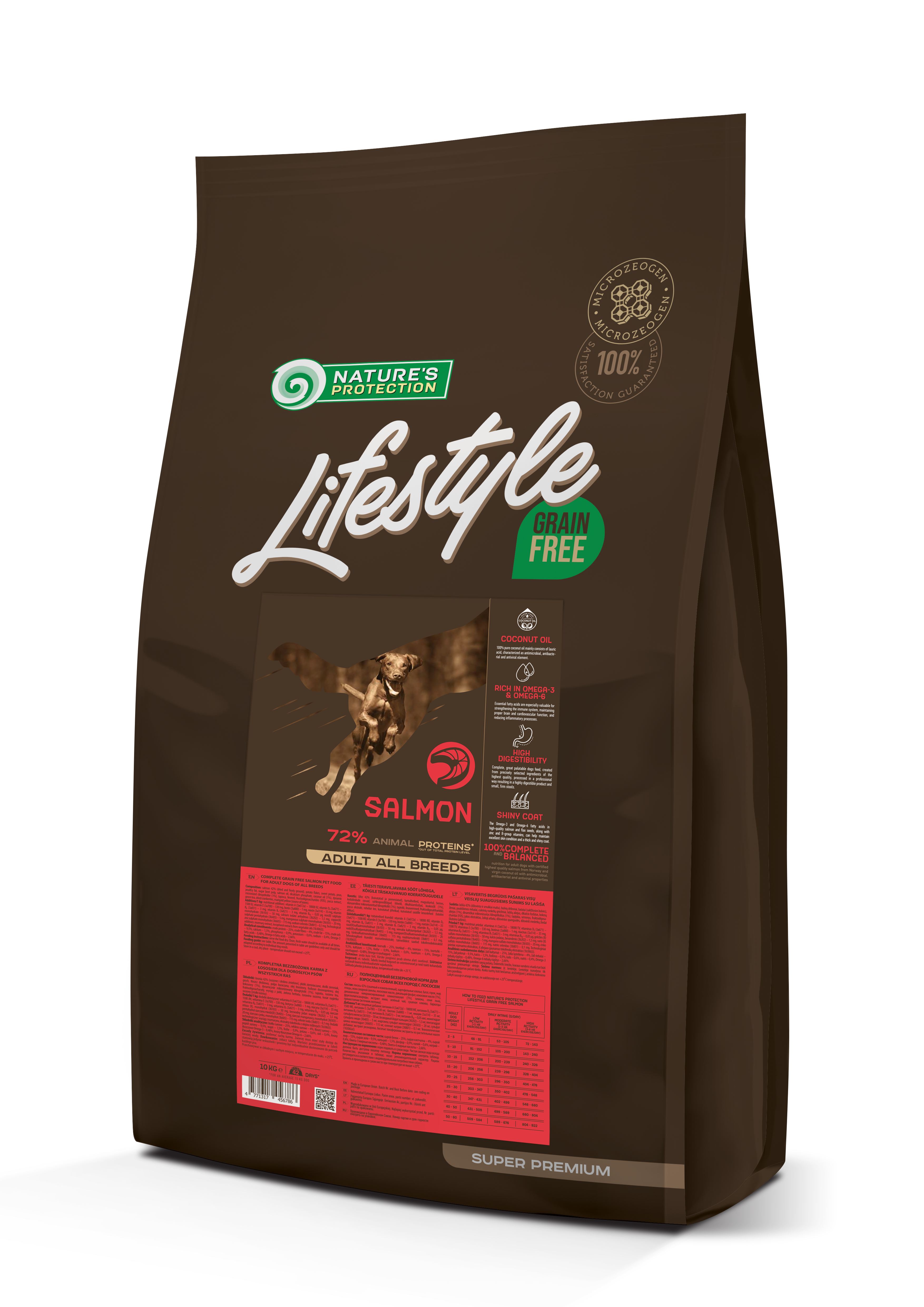 Nature's Protection Lifestyle Adult All Breeds with Salmon is known for its well-balanced composition and raw materials, which provide optimal nutrition for adult dogs of all breeds. The main source of protein in this complete dry dog food is salmon. Salmon is a great source of high-quality protein and nutrients. Salmon is easily digestible, rich in omega-3 fatty acids, and is considered as a hypoallergenic source of protein. The complete and balanced composition of this dry dog food is enriched with clinoptilolite of volcanic origin from nature – MicroZeoGen. It helps to remove toxins from the pet's body and when it is detoxified the efficient nutrients, vitamins, and minerals easily absorb into the body. The composition also contains Omega-3 and Omega-6 fatty acids and coconut oil, that are essential for promoting healthy skin and coat, supporting immune system function, and aiding in digestion. The composition does not contain ingredients of grain origin, so it can help to reduce the risk of allergies for dogs with sensitive digestive systems. This complete dry dog food supports the maintenance of a healthy weight, ensuring optimal energy levels for your adult dog.