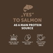 Composition: salmon 42% (dried and finely ground), potato flakes, sweet potato, peas, poultry fat, sugar beet pulp, salmon oil, dicalcium phosphate, coconut oil (1%), dynamic micronized clinoptilolite (1%), tapioca, linseed, fructooligosaccharides (FOS), yucca extract, green tea, dried cranberries, marigold yellow (source of lutein).