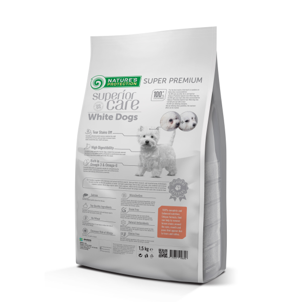 Nature‘s Protection Superior Care White Dogs Grain Free with Salmon for Adult Small and Mini Breeds is known for its well-balanced composition and raw materials which help to fight against brown tears stains and to keep healthy skin and coat. The main source of protein in this complete dry dog food is salmon, a hypoallergenic, rich in omega acidsingredient. The complete and balanced composition of this dry dog food is enriched with clinoptilolite of volcanic originfrom nature - MicroZeoGen. It helps to remove toxins from the pet's body and when it is detoxified the efficient nutrients, vitamins, and minerals easily absorb into the body. The composition is fortifield with Omega -3 and Omega - 6 fatty acids, essential for maintaining healthy skin and a shiny coat. As well as mono- and polyunsaturated fatty acids that supports immune system while saturated fatty acids provides energy to a dog.