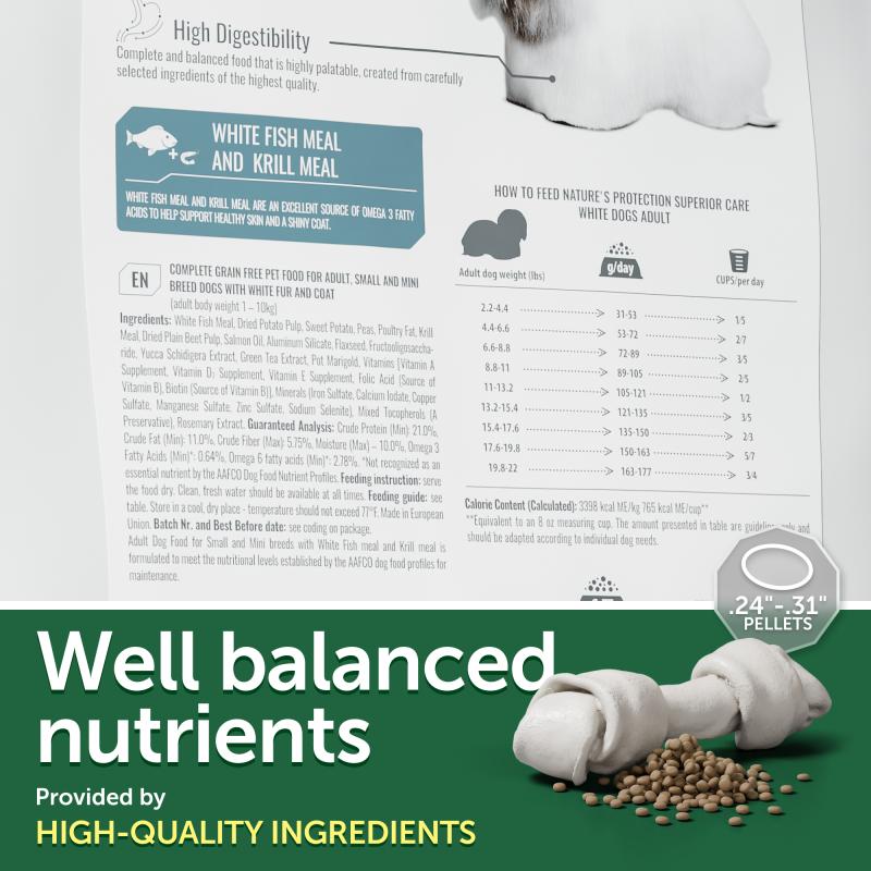 Nature‘s Protection Superior Care White Dogs Grain Free with White fish for Adult Small and mini Breeds is known for its well-balanced composition and raw materials which help to fight against brown tears stains and to keep healthy skin and coat. The main source of protein in this complete dry dog food is white fish. It is hypoallergenic, easily digestible, perfect for weight control and a great source of vitamins A and D. It also contains Antarctic krill, a unique and 100% sustainable source of Omega-3 and choline for healthy development. The complete and balanced composition of this dry dog food is enriched with clinoptilolite of volcanic origin from nature - MicroZeoGen. It helps to remove toxins from the pet's body and when it is detoxified the efficient nutrients, vitamins, and minerals easily absorb into the body. The composition is enriched with superior sources of Omega-3 fatty acids that could help to maintain the intensive colour of the coat and the perfect condition of the skin.