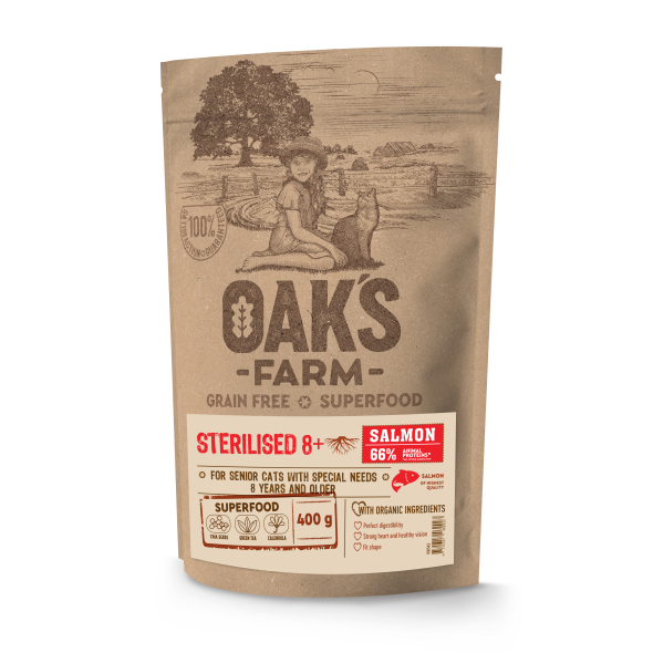- OAK'S FARM dry grain free food for senior cats after sterilisation with salmon 400 g