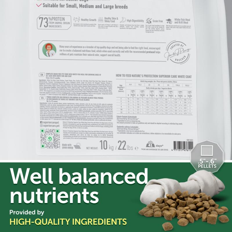 Nature's Protection Superior Care dry Grain Free pet food with White Fish for Junior Dogs of All Sizes with a White and Light–colored Coat is known for its well-balanced composition and raw materials. This feed kibble size is very versatile. Measuring 13-15 mm, it suits dogs of all sizes. It is perfect for larger breeds who prefer eating smaller kibble, allowing them to eat more at once and improve their digestion system. For young dogs that love bigger kibble, it is a favorable choice to help them to learn properly chew and swallow feed. Chewing the kibble may help the dog maintain good dental health. This complete dry dog food fights against brown tears stains and keeps healthy skin and coat.