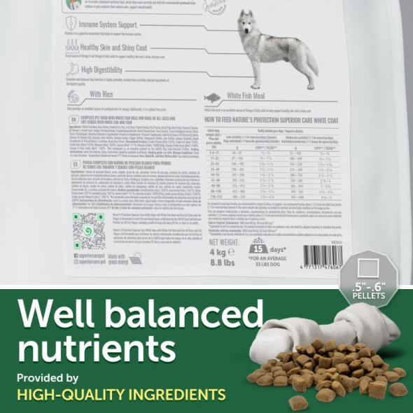 Nature's Protection Superior Care dry pet food with White Fish for Dogs of All Sizes and Life Stages with a White and Light–colored Coat is known for its well-balanced composition and raw materials. This feed kibble size is very versatile. Measuring 13-15 mm, it suits dogs of all sizes and ages. It is perfect for larger breeds who prefer eating smaller kibble, allowing them to eat more at once and improve their digestion system. For young dogs that love bigger kibble, it is a favorable choice to help them to learn properly chew and swallow feed. Chewing the kibble may help the dog maintain good dental health. This complete dry dog food fights against brown tears stains and keeps healthy skin and coat.