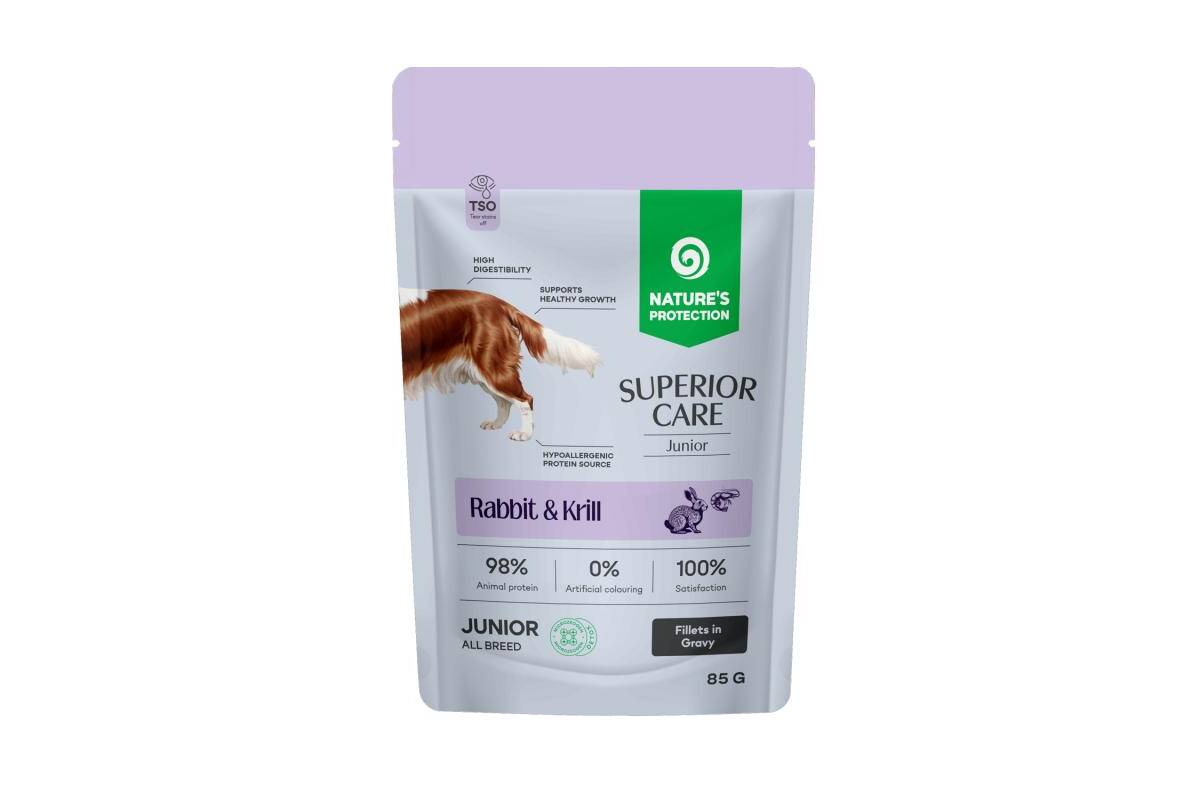 NATURALNESS AND INNOVATION IN EVERY BITE. Nature’s Protection Superior Care Junior is the solution for those who want food that is not only tasty but also functional. Rabbit and krill – easily digestible proteins suitable for sensitive dogs – provide the body with important nutrients. Omega-3 fatty acids care for the skin, while Microzeogen® Formula– complex of vitamin E with zinc, copper, and manganese supports the body’s natural detox processes by reinforcing cellular antioxidant defenses.