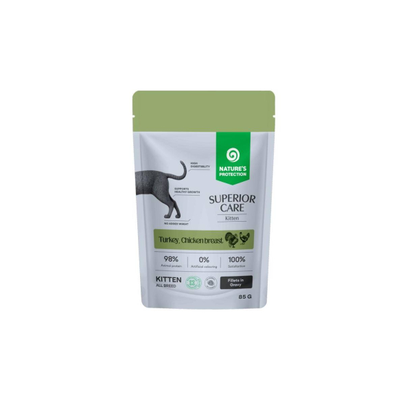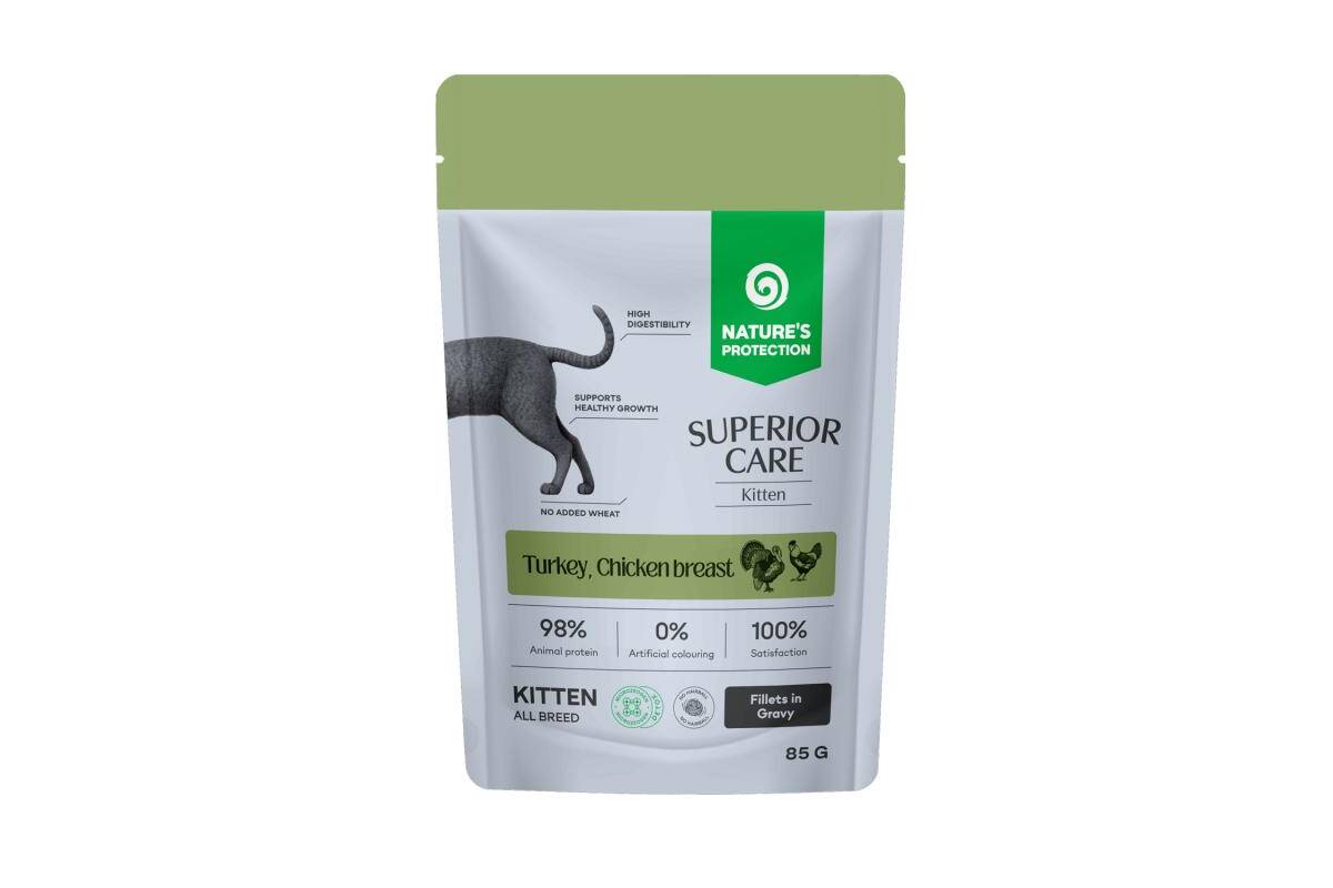 NATURALNESS AND INNOVATION IN EVERY BITE. Nature’s Protection Superior Care Kitten is the solution for those who want food that is not only tasty but also functional. Turkey and chicken breast – easily digestible proteins suitable for sensitive kittens – provide the body with important nutrients. Omega-3 fatty acids care for the skin, while Microzeogen® Formula– complex of vitamin E with zinc, copper, and manganese supports the body’s natural detox processes by reinforcing cellular antioxidant defenses.