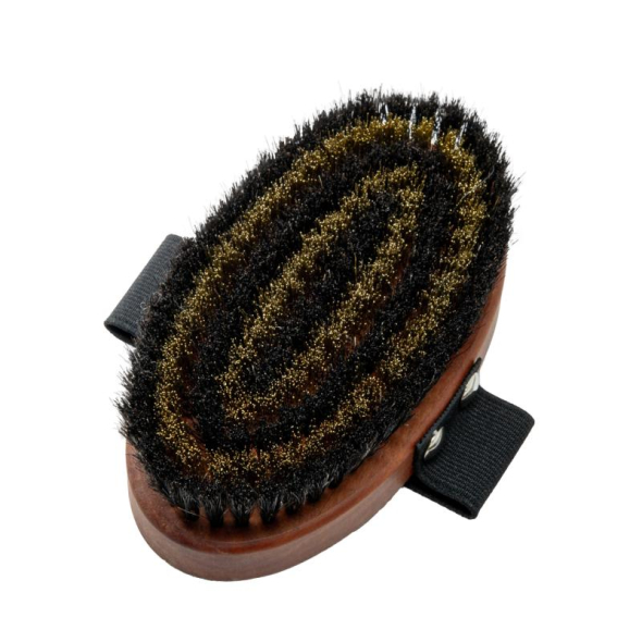 TAURO PRO LINE Massage brush, pear wood, brass metal and horse hair bristles, light brown oval shape, 13.5x7 cm