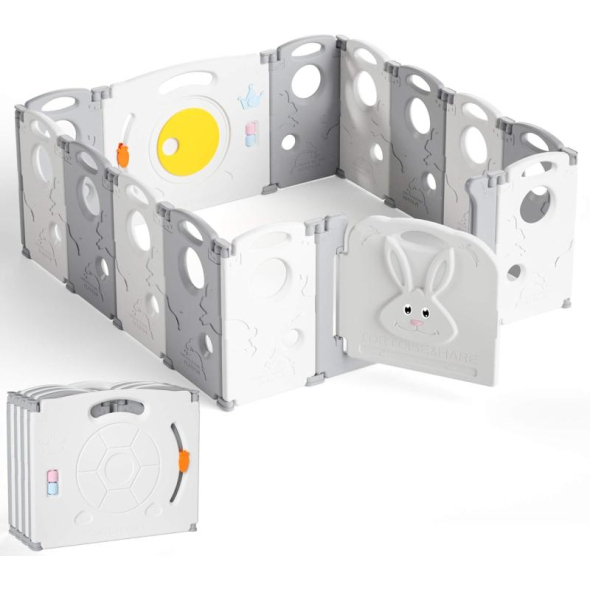The high-quality “HyperSun Tortoise & Hare Playpen” is designed to provide your pet with a safe space indoors or outdoors. The structure consists of 12 main panels and 2 additional ones, allowing you to easily shape the playpen into different forms – rectangular, square, or polygonal – depending on your space.