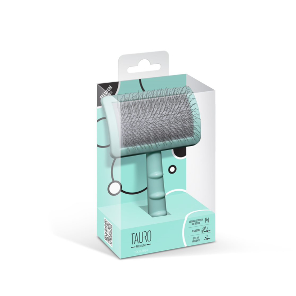The Tauro Pro Line premium brush is expertly designed to make pet brushing easier. Its ergonomic design ensures it is lightweight, preventing hand fatigue during brushing sessions. The soft and elastic cushion adapts to your pet's skin, while the 20 mm long curved stainless steel teeth effectively comb through the coat, remove dead hair and tangles, and provide a gentle massage to improve circulation and promote hair growth. With this Tauro Pro Line brush, you can easily reach even hard-to-reach areas: armpits, muzzle, ears, and paws. Suitable for all coat types and compatible with small, medium, and large breeds. The special anti-static coating on the brush prevents hair from becoming electrified, resulting in smoother and shinier coats. Discover the Tauro Pro Line brushes, crafted by professionals using top-quality materials to ensure optimal results and an enjoyable brushing experience.