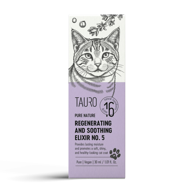 TAURO Pure Nature Regenerating & Soothing Elixir No. 5 is designed for the care of sensitive cat skin and coat. A complex of natural oils and plant extracts helps moisturize, soothe irritated skin and support a soft, well-maintained coat condition.