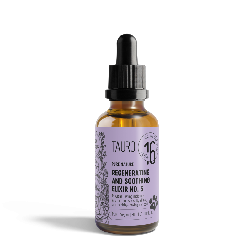 TAURO Pure Nature Regenerating & Soothing Elixir No. 5 is designed for the care of cat skin and coat when the goal is to maintain natural moisture balance, soothe sensitive skin and improve the appearance of the coat. A carefully selected complex of natural plant oils and botanical extracts helps support skin comfort and contributes to a softer coat texture.