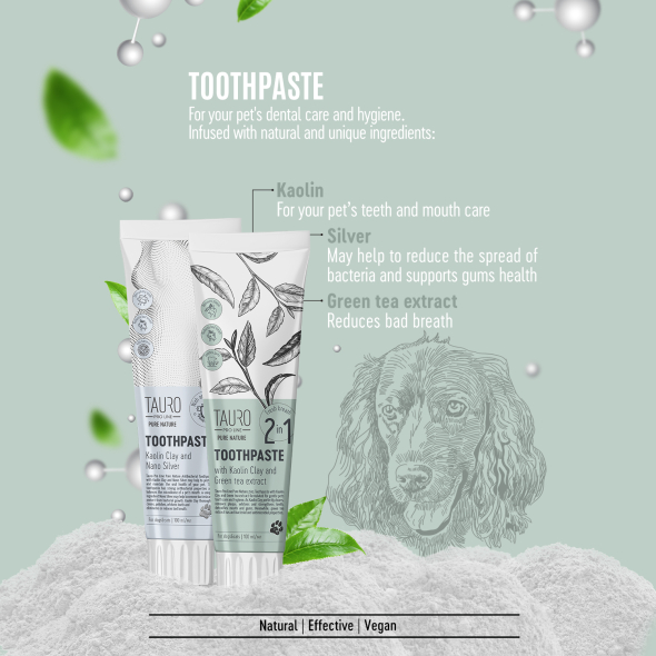 Tauro Pro Line Pure Nature toothpaste, with white clay (kaolin) and silver nanoparticles, has an antibacterial effect that protects and balances your pet's oral health. Regular use of this toothpaste and its ingredients gently and effectively clean your pet's teeth, preventing plaque build-up. White clay (kaolin) in this toothpaste cleans, whitens and protects teeth and gums against plaque buildup. Kaolin is all-natural and effective teeth cleanser that is completely safe to use. Silver nanoparticles possess antibacterial properties that remove bacteria and hinder their multiplication, reducing plaque and tartar formation and maintaining your pet's good oral hygiene. Toothpaste can help reduce bad breath and give a fresh feeling.