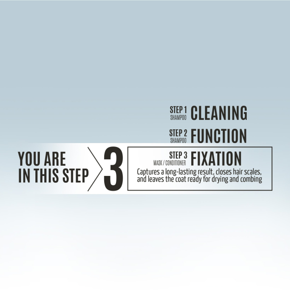 INSTRUCTION FOR USE: dilute the conditioner with water 1:10. Gently massage into the coat. Leave in for about 3 minutes. Rinse thoroughly with warm water.