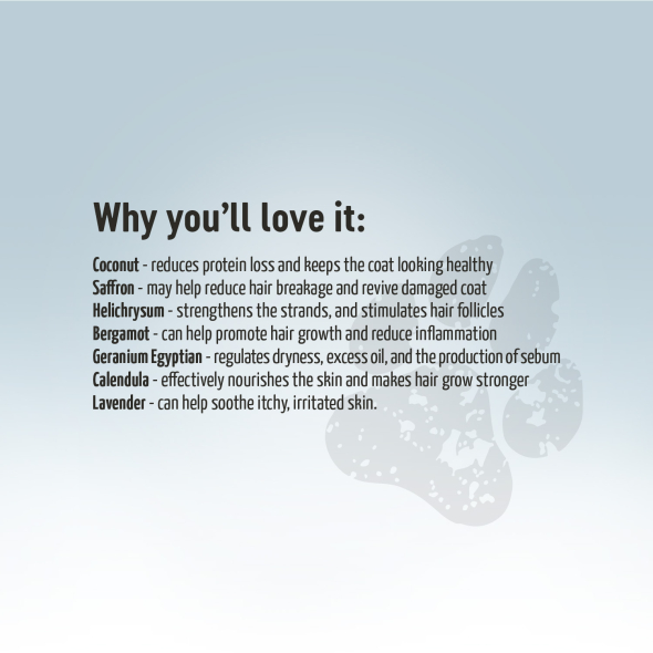 Orange essential oil to balance the production of sebum and to refresh and clean the coat.