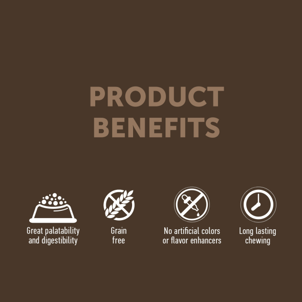 It is a natural source of protein and iron, helping to maintain muscle tone, energy balance, and proper weight control. The addition of cod and poultry provides extra high-quality proteins and Omega-3 fatty acids, which support healthy skin and a shiny coat. The firm texture of the cattle hide ensures that the treat is not only tasty but also functional – chewing helps naturally clean teeth, reduce plaque buildup, and massage gums. In this way, these treats contribute to maintaining oral hygiene and keeping breath fresh. The product is made without grains or grain-based ingredients, making it suitable even for sensitive or allergic pets. It contains no artificial colors, flavor enhancers, or antioxidants – only natural components beneficial to your dog’s health.