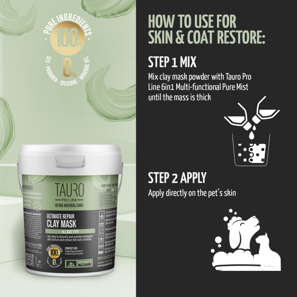 TAURO PRO LINE Ultra Natural Care clay mask is created for dogs and cats skin and coat care using a mineral-rich formula. The combination of zeolite and natural clays helps gently remove accumulated impurities and excess oils, supporting clean and balanced skin during routine care.