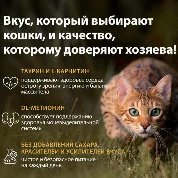 IMPORTANT ELEMENTS FOR DAILY HEALTH. Enriched with taurine, an essential amino acid necessary for cats' vision, heart function, and nervous system. L-carnitine helps maintain proper energy metabolism and weight control, while DL-methionine helps support proper urinary tract health. Vitamins A, D3, and E, as well as minerals, help strengthen the immune system, maintain strong bones, and ensure overall balance in the body.