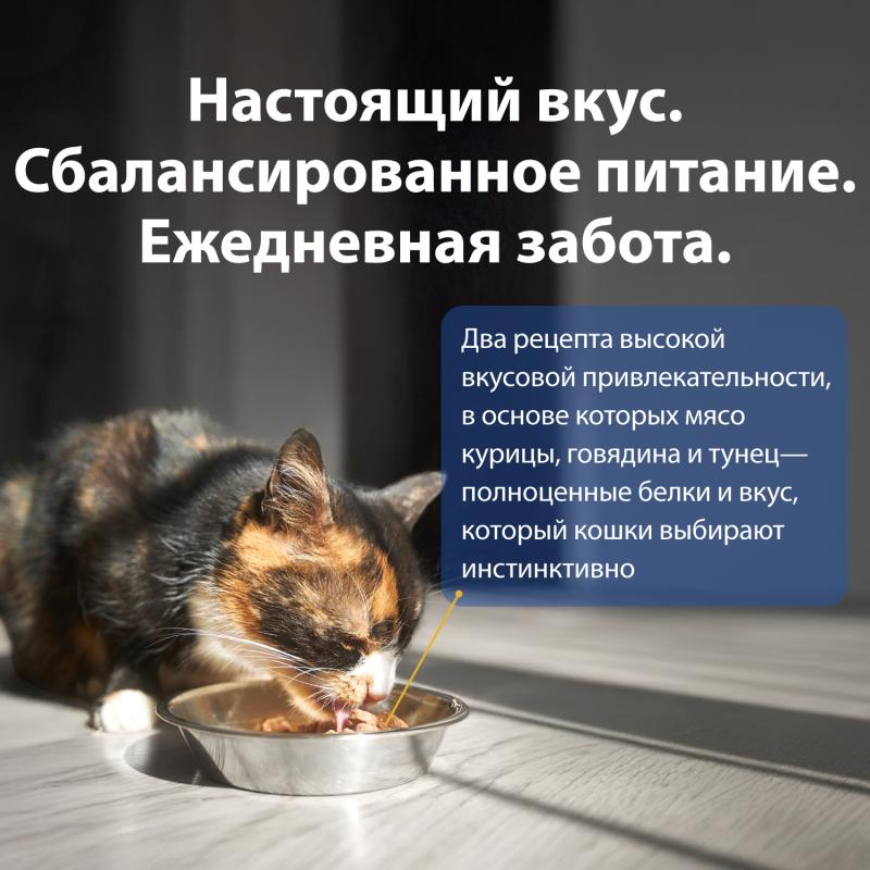 PIECES IN A JUICY SAUCE. High-quality proteins provide the body with nutrients, help maintain energy levels and overall well-being. The sauce helps maintain proper fluid levels in the body, which is especially important for cats that drink less water.
