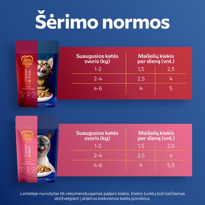LOVELY HUNTER wet pet food set for adult cats of all breeds with chicken and beef, with chicken and tuna 4x85 g