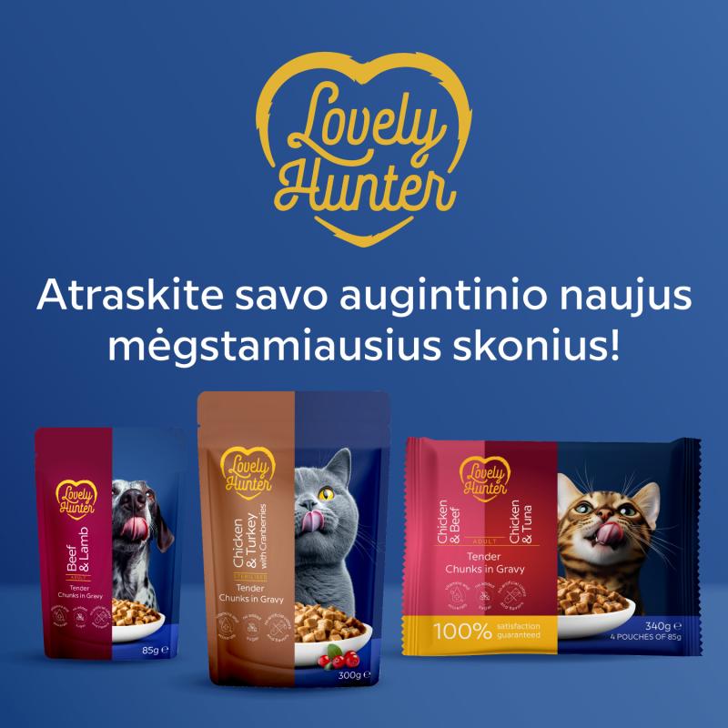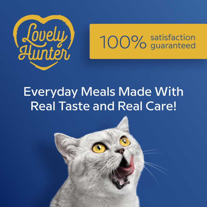 THE TASTE CATS CHOOSE. Lovely Hunter wet food with chicken and beef or chicken and tuna is an everyday solution for adult cats, combining delicious taste, essential proteins, and important nutrients.