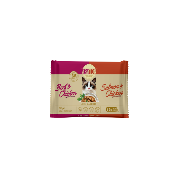 ARATON wet pet food set for adult cats of all breeds with beef and chicken, with salmon and chicken 4x85 g