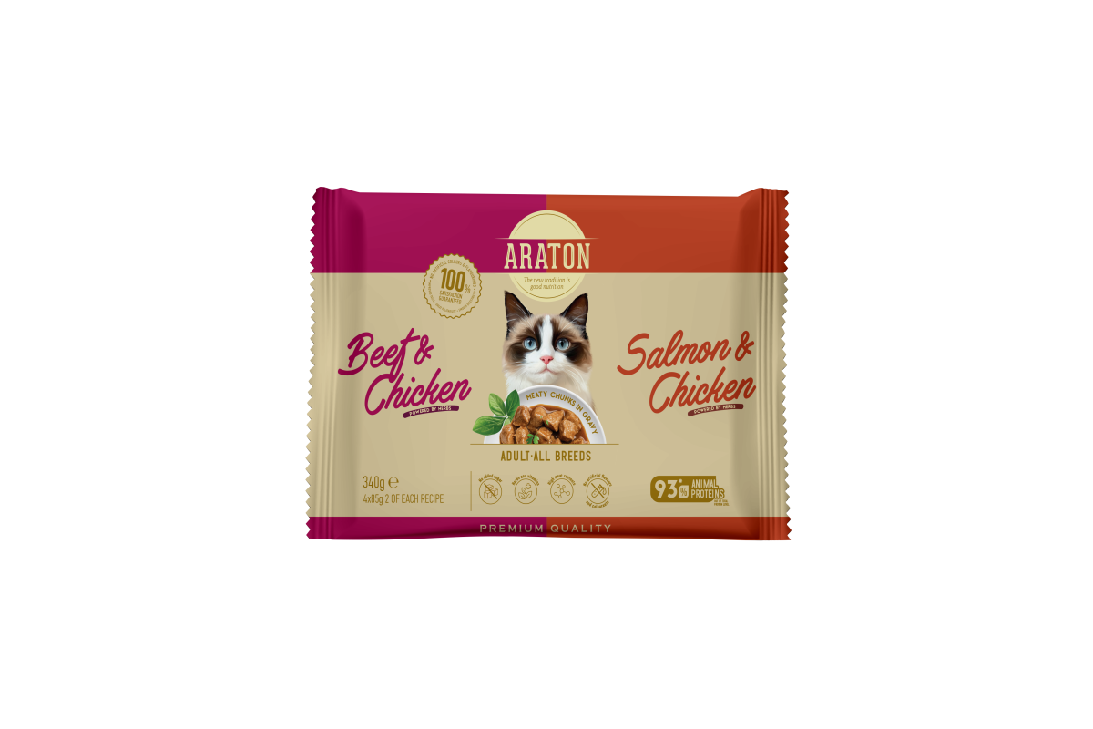ARATON complete wet food with salmon and chicken and with beef and chicken is a set of two flavors, created for everyday feeding, when you want not only nutritional benefits, but also variety. Cats love variety, but not everything that smells good is well digested.