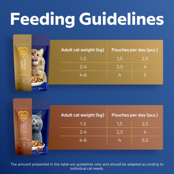 THE TASTE THAT CATS CHOOSE. The diet of sterilized cats requires a special balance – fewer calories, more attention to the urinary system and overall health. Lovely Hunter wet food for sterilized cats is specially formulated to care for the well-being of sterilized cats every day.