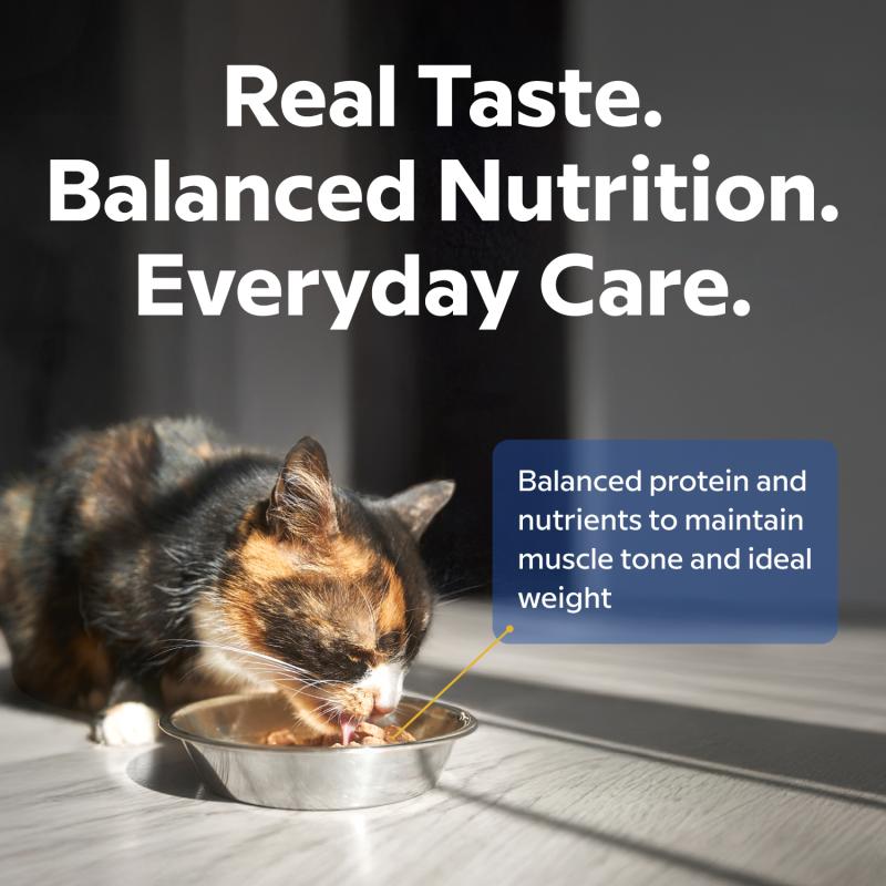 PIECES IN A JUICY SAUCE. The high-quality protein in wet food helps maintain muscle tone while keeping your cat at an optimal weight and in good overall health. The sauce helps maintain proper fluid levels in the body, which is especially important for cats that drink less water.