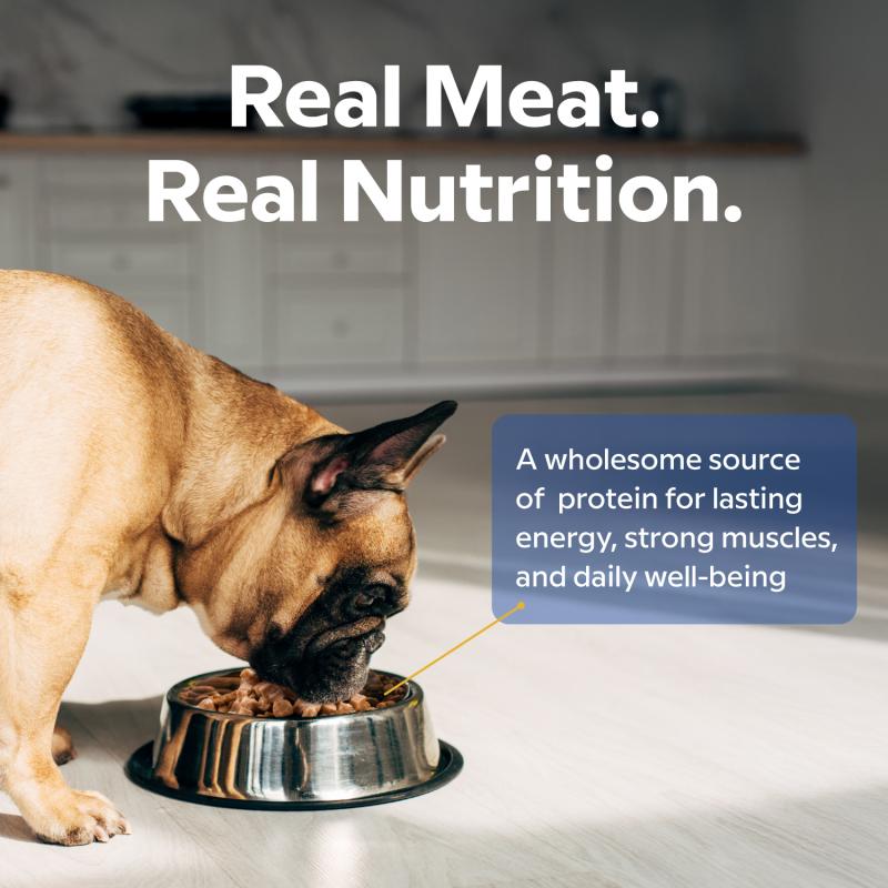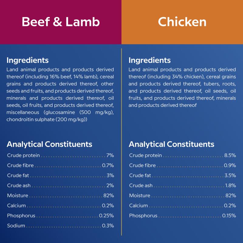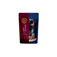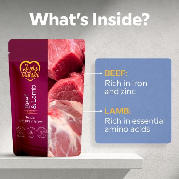 PIECES IN A JUICY SAUCE. The combination of beef and lamb provides a natural taste and animal-based proteins, which are necessary for muscle maintenance, endurance, and energy. The gravy makes it even more palatable and helps maintain proper fluid levels in the body, which is especially important for dogs that drink less water.