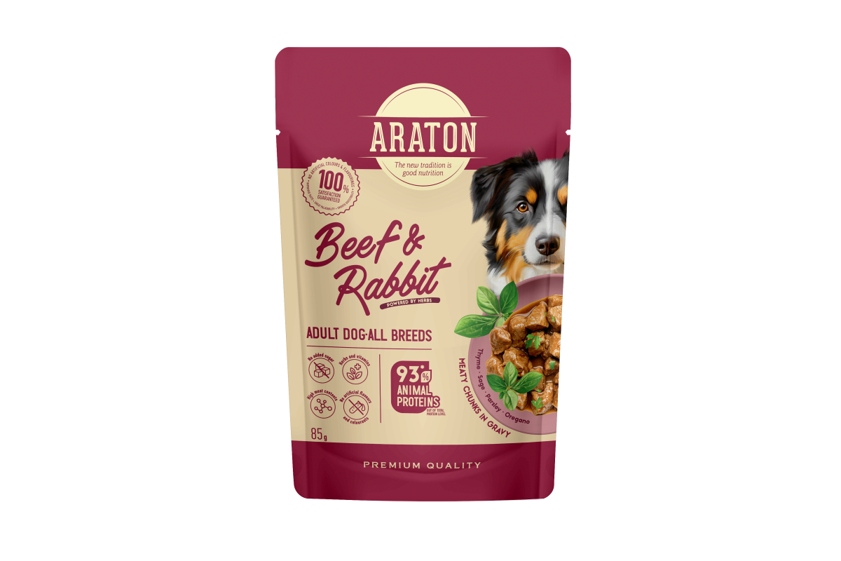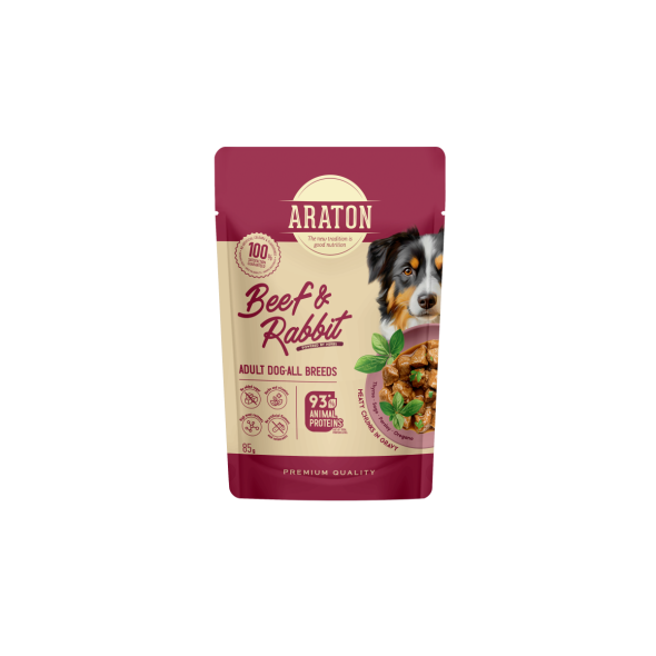 ARATON complete wet food with beef and rabbit - where natural taste meets real value for your dog's health. This food has been developed for adult dogs of all breeds, for daily feeding and without excessive additives, but with a beneficial content. Chunks in a succulent sauce, 78% animal ingredients, supplemented with herbs - all designed with the dog's natural instinct and the owner's desire to give what is real in mind. 93% animal protein - more than just taste.