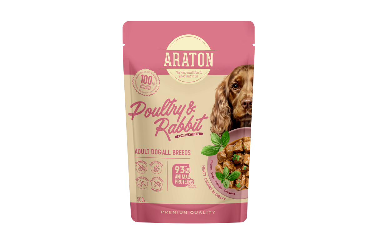 ARATON complete wet food with poultry and rabbit is a balanced choice for adult dogs.