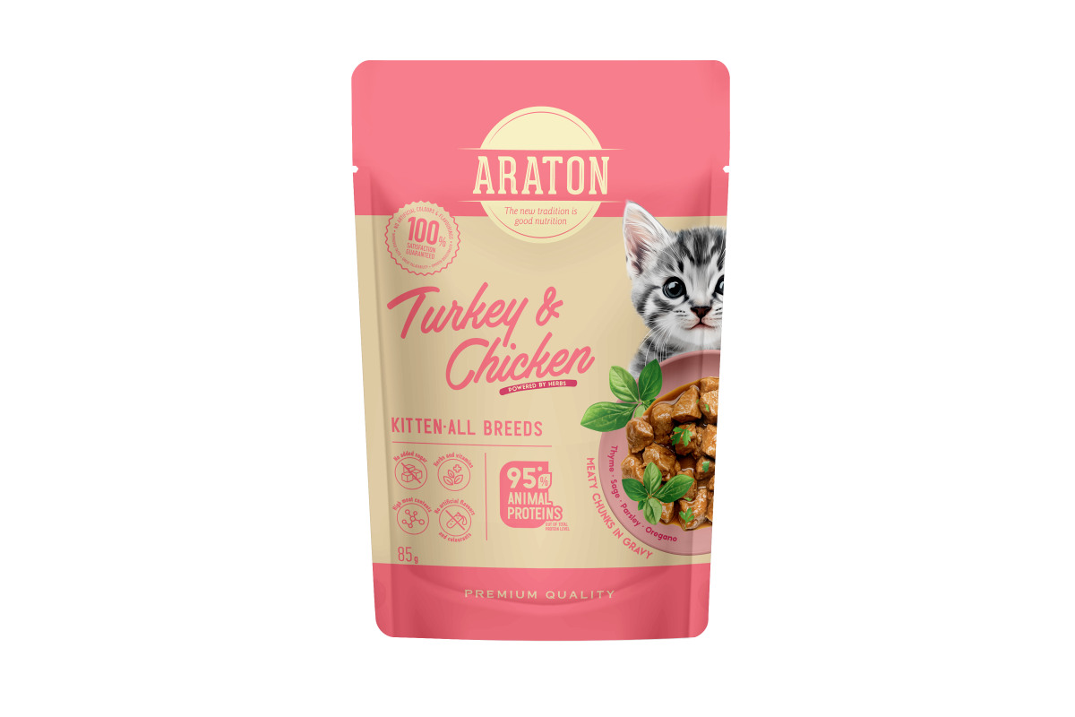 ARATON Complete Wet Food with Chicken and Turkey is a balanced choice for growing kittens. When a small kitten is growing, it's not only important to keep him or her full - every bite must ensure healthy development, strong immunity and easy digestion. This food is designed to help build a strong foundation for your pet from the first months of life.