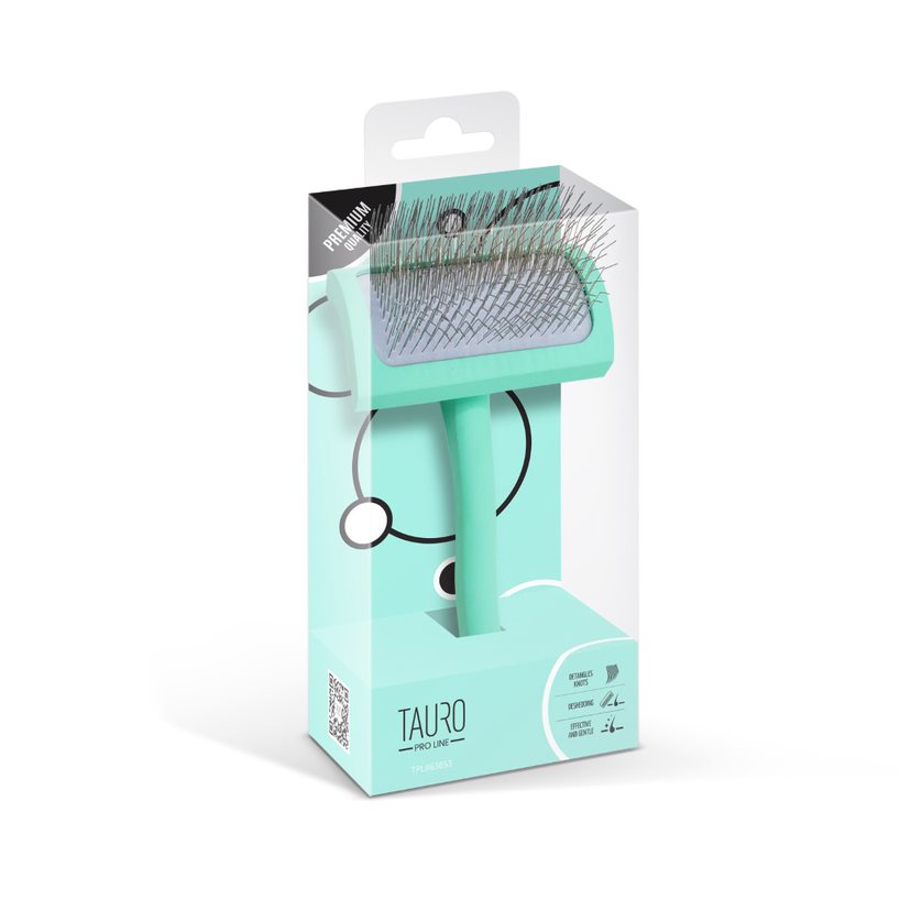 The Tauro Pro Line premium brush is expertly designed to make pet brushing easier. The brush has an ergonomically designed rectangular shape and is very lightweight, ensuring your hands won't tire while brushing. The soft and elastic cushion adapts to your pet's skin, while the 11 mm long curved stainless steel teeth effectively comb through the coat, remove dead hair and tangles, and provide a gentle massage to improve circulation and promote hair growth. With this Tauro Pro Line brush, you can easily reach even hard-to-reach areas: armpits, muzzle, ears, and paws. Suitable for all coat types and compatible with small, medium, and large breeds. The special anti-static coating on the brush prevents hair from becoming electrified, resulting in smoother and shinier coats. Discover the Tauro Pro Line brushes, crafted by professionals using top-quality materials to ensure optimal results and an enjoyable brushing experience.